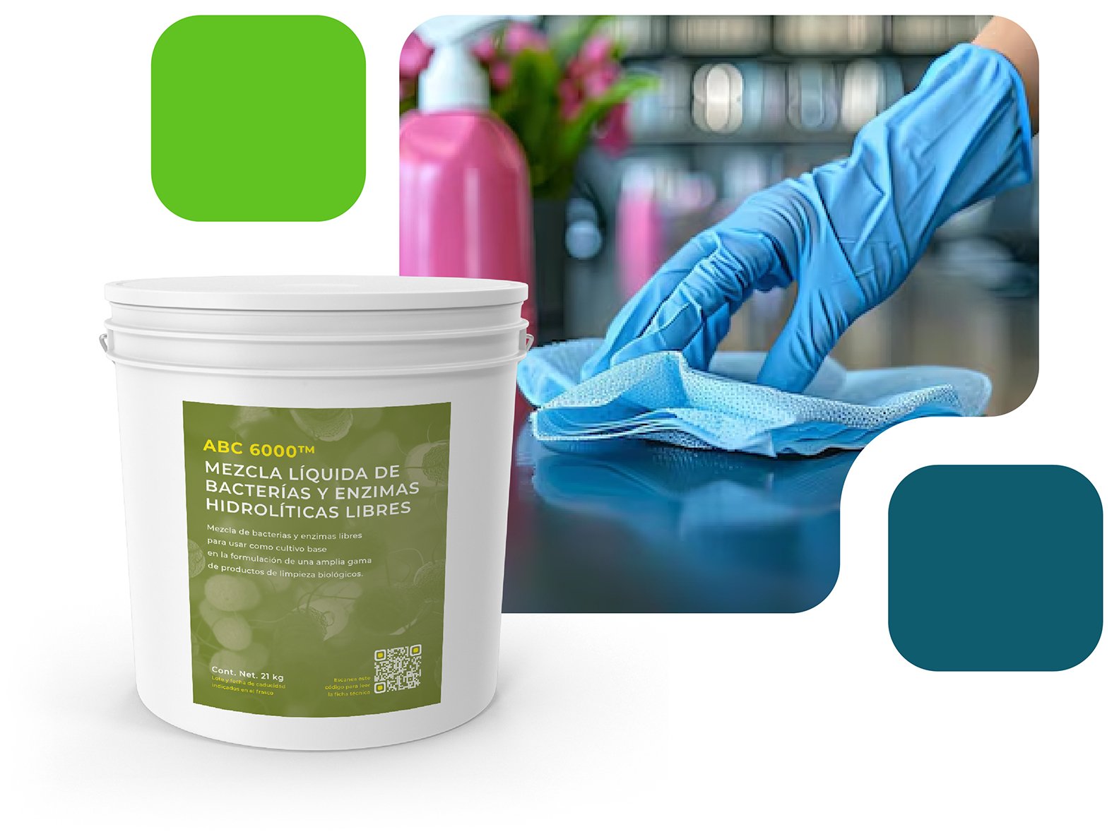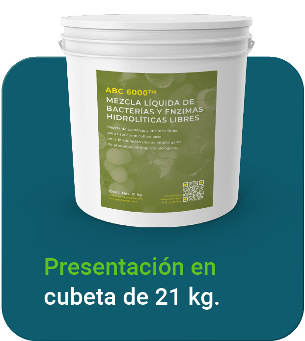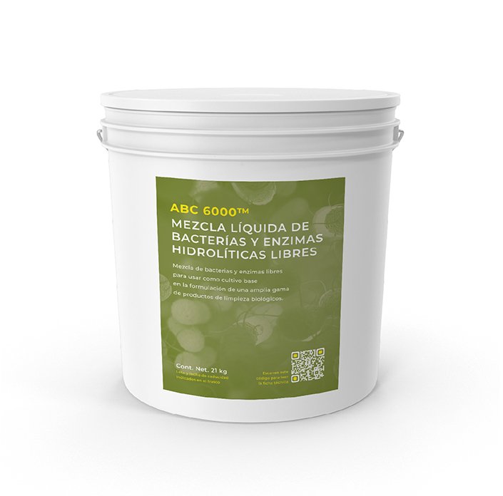ABC 6000™ es una mezcla de bacterias y enzimas (proteasa, amilasa, celulasa, y lipasa) ideal para formulaciones de limpieza biológica. Estas bacterias no patógenas y enzimas eliminan olores en desechos orgánicos, solubilizando grasas, aceites, almidones, proteínas y celulosa sin olor residual. Su formato líquido y preestabilizado facilita la formulación y reduce costos de inventario y envío.