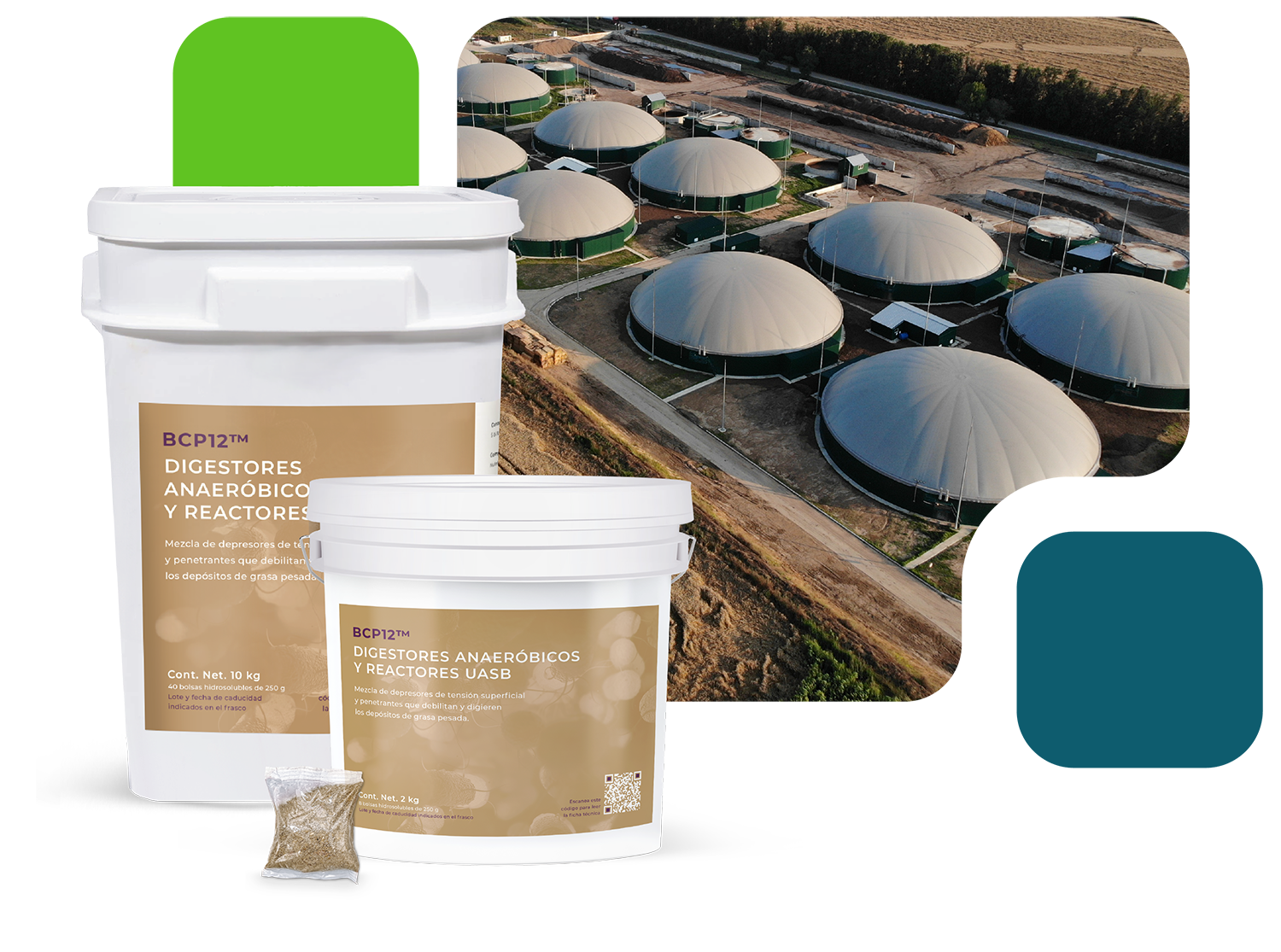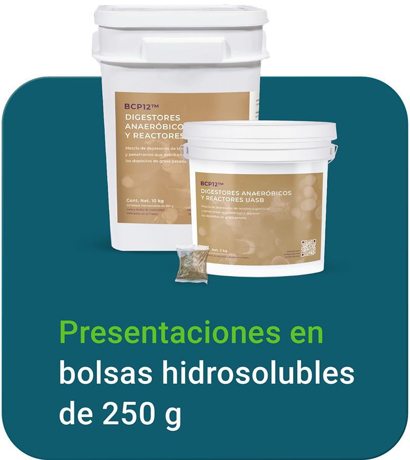 BCP12™ es una mezcla de depresores de tensión superficial y penetrantes que degradan depósitos de grasa pesada, mejorando la eficiencia de digestores anaeróbicos y reactores UASB. Además, impulsa la producción de biogás. Su mezcla microbiana es anaeróbica facultativa, capaz de crecer en ambientes sin oxígeno utilizando nitrato.
