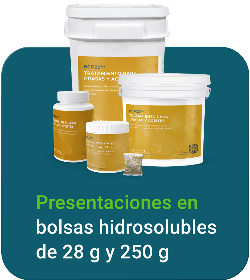 BCP22™ es una mezcla de bacterias aeróbicas y anaeróbicas facultativas que digiere grasas y aceites (GyA). Acelera la degradación de aguas residuales con alto contenido de GyA, ideal para la industria alimentaria. Facilita la limpieza de trampas de grasa, alcantarillas y desagües, y es útil en sobrecargas, puesta en marcha y mantenimiento de sistemas de tratamiento de aguas con altos niveles de GyA.