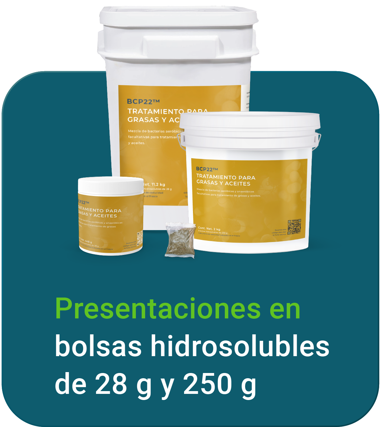 BCP22™ es una mezcla de bacterias aeróbicas y anaeróbicas facultativas que digiere grasas y aceites (GyA). Acelera la degradación de aguas residuales con alto contenido de GyA, ideal para la industria alimentaria. Facilita la limpieza de trampas de grasa, alcantarillas y desagües, y es útil en sobrecargas, puesta en marcha y mantenimiento de sistemas de tratamiento de aguas con altos niveles de GyA.