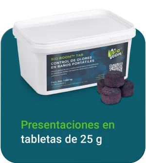 BIO BOOM™ TAB trata y desodoriza baños portátiles y inodoros móviles de manera rápida, dejando una fragancia fresca. Sus microorganismos digieren desechos orgánicos y siguen actuando en el tanque de retención. Es libre de biocidas y productos químicos agresivos, seguro para plantas de tratamiento. Las bolsas son fáciles de usar, solubles en agua, y no requieren medición.