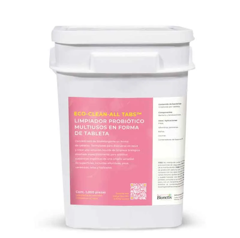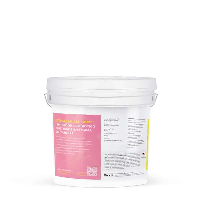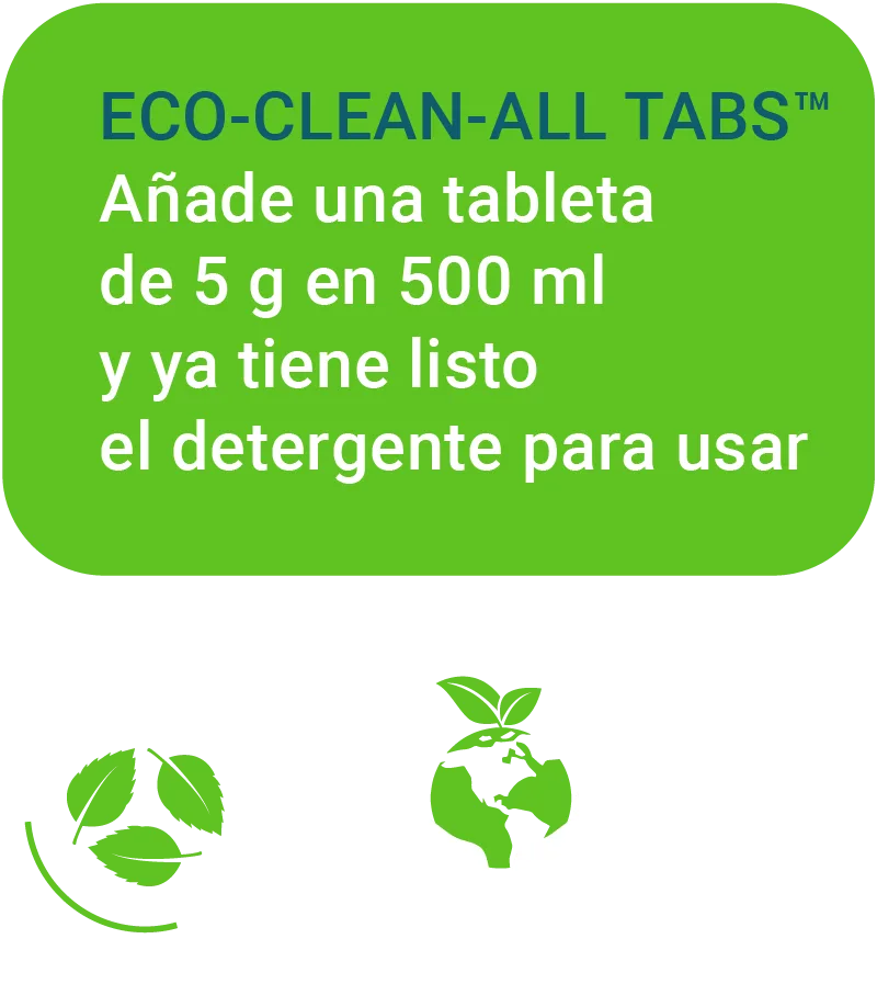ECO-CLEAN-ALL TABS™ es un biodetergente en tabletas que se disuelven en agua para crear una solución de limpieza biológica. Elimina sustancias orgánicas de diversas superficies, como alfombras, pisos cerámicos, telas y tapizados. Combina tensioactivos biodegradables y probióticos que digieren grasas, aceites, proteínas y almidón, manteniendo las superficies limpias y sin olores. Los probióticos continúan actuando después de la aplicación para prolongar la limpieza y eliminación de olores.
