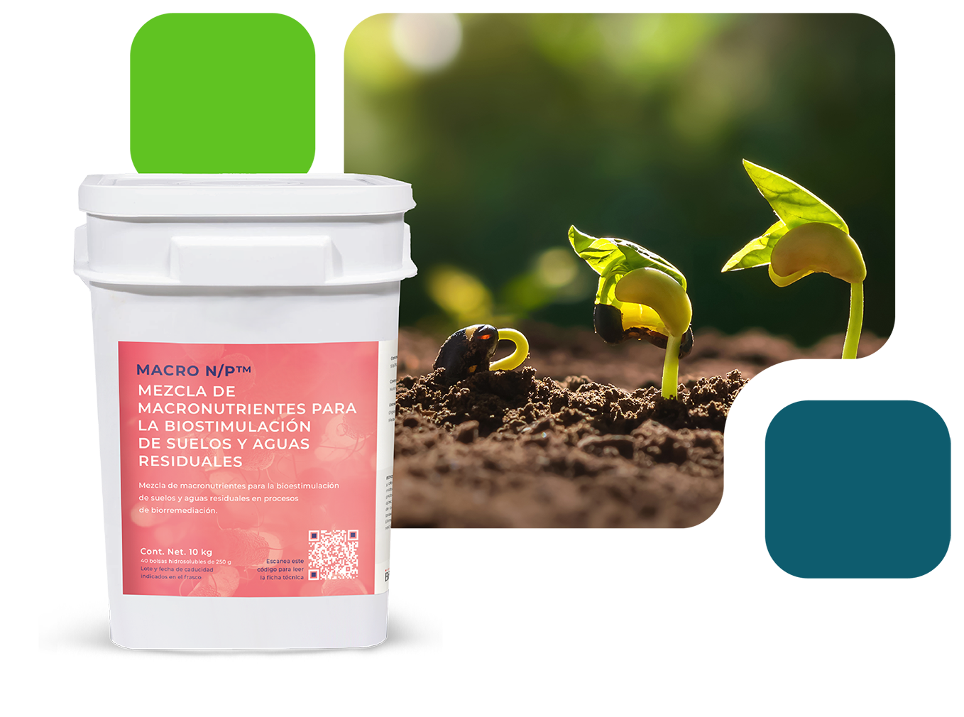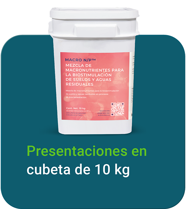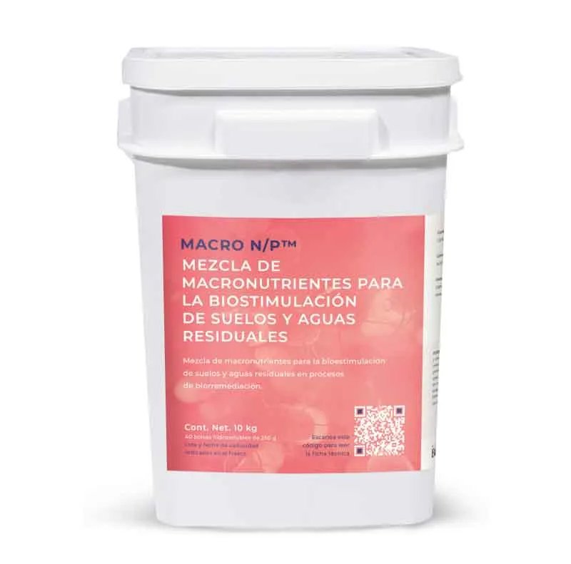 Mezcla de macronutrientes para aguas residuales y suelos, que impulsa el crecimiento celular y la actividad metabólica. MACRO N/P™ es una mezcla de macronutrientes diseñada para la bioestimulación en biorremediación de suelos y aguas residuales, fomentando el crecimiento y reproducción de bacterias. Con una proporción óptima de N:P de 5:1, este producto mejora los procesos biológicos al aportar nitrógeno y fósforo esenciales. Es necesario evaluar los nutrientes disponibles en el efluente o suelo para determinar la dosis adecuada de MACRO N/P™.