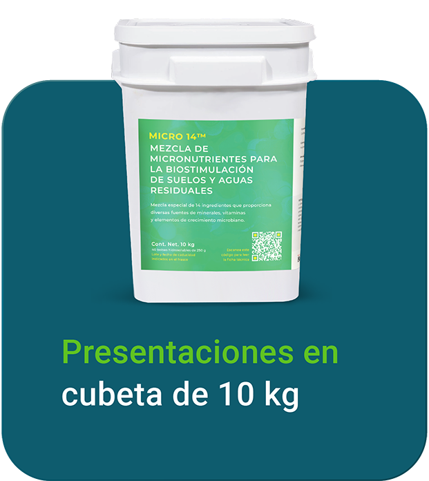 MICRO 14™ es una mezcla de 14 ingredientes que aporta minerales, vitaminas y elementos esenciales para la actividad microbiana, mejorando la degradación de materiales orgánicos en suelos y aguas con deficiencia de nutrientes. Contiene micronutrientes clave como hierro, azufre y zinc, además de co-metabolitos y aminoácidos esenciales. Su formulación completa supera a otros fertilizantes comerciales, proporcionando un balance óptimo para el crecimiento bacteriano y una biorremediación eficaz.