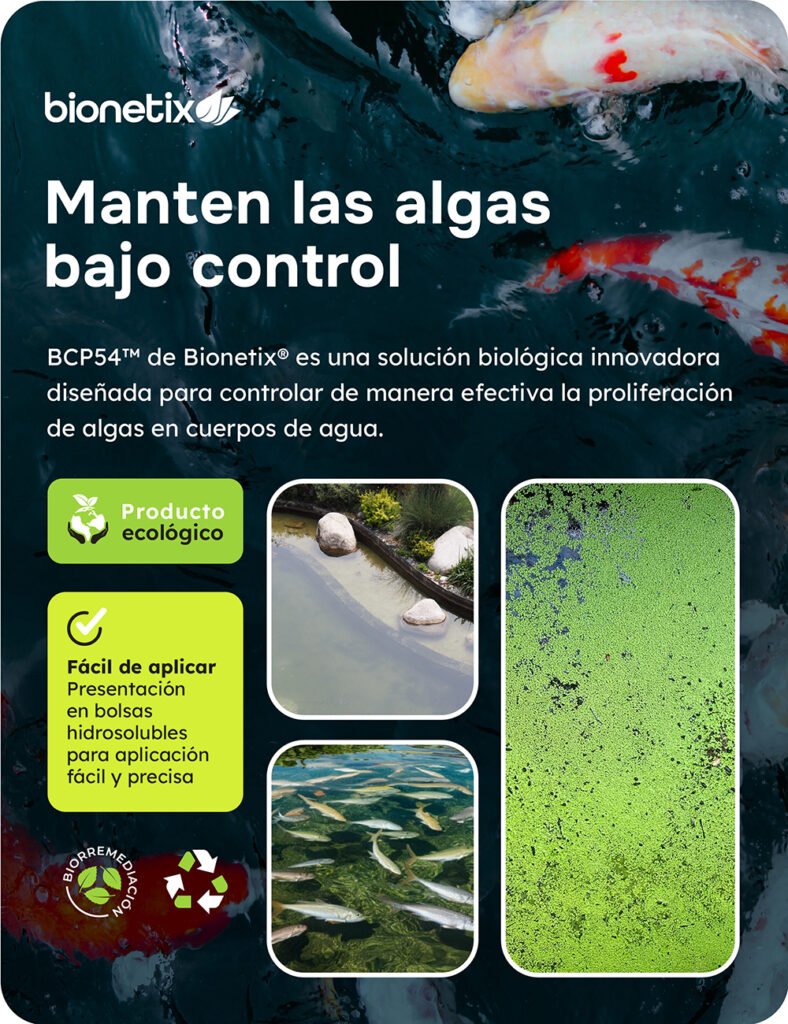 Las algas pueden causar problemas en cuerpos de agua, afectando la calidad y la salud del ecosistema al disminuir el oxígeno, obstruir la luz y generar toxinas. BCP54™ de Bionetix® es una solución biológica innovadora diseñada para controlar de manera efectiva la proliferación de algas en cuerpos de agua.